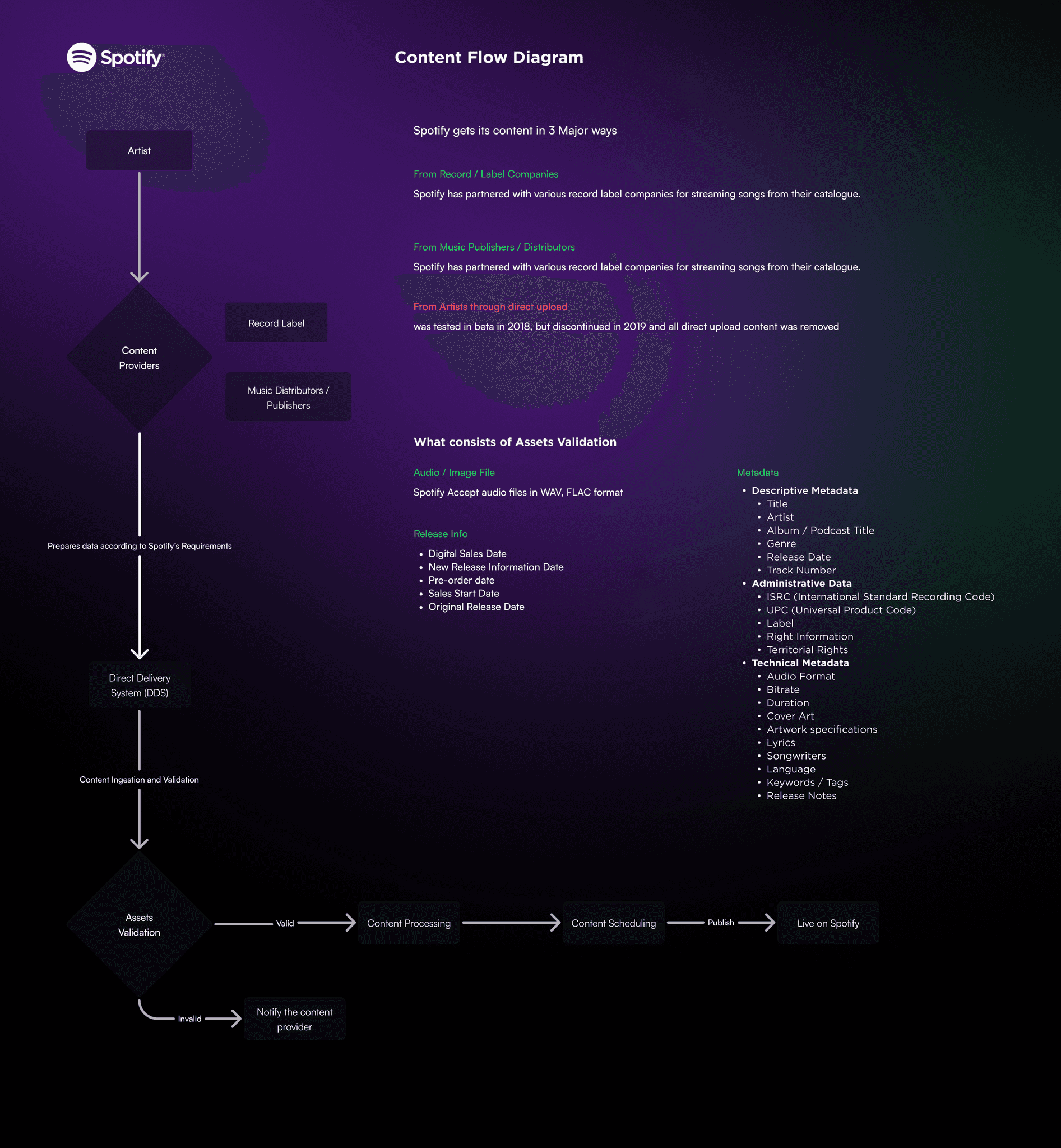 This flow maps how content enters Spotify (labels/distributors), what gets delivered (audio, artwork, metadata), and why validation is critical before publishing.