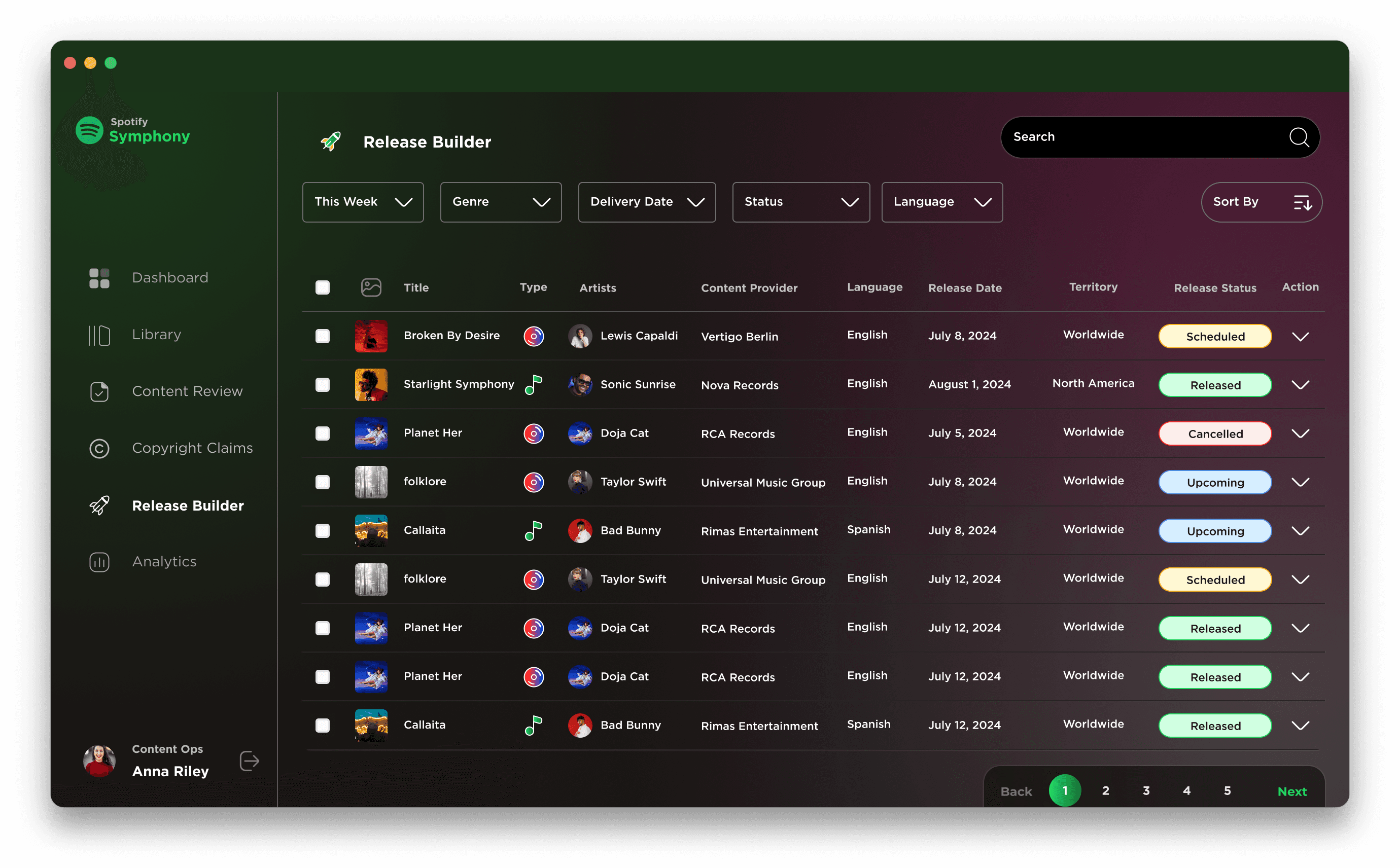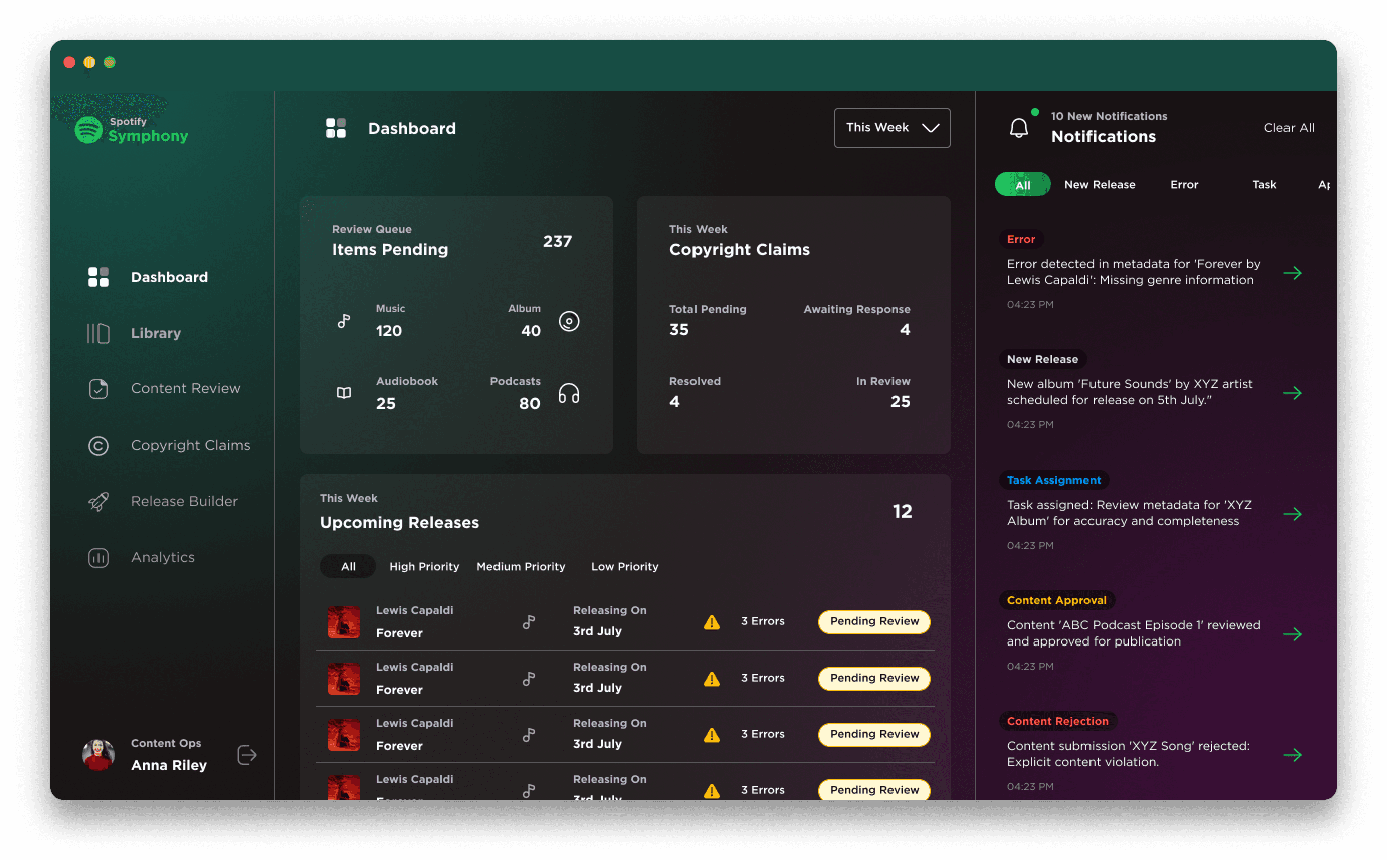 Spotify’s content operations run on a multi-step internal pipeline — ingestion → validation → review → scheduling → release. At scale, table-heavy tools make it hard to see what’s stuck, what’s urgent, and who owns the next step.