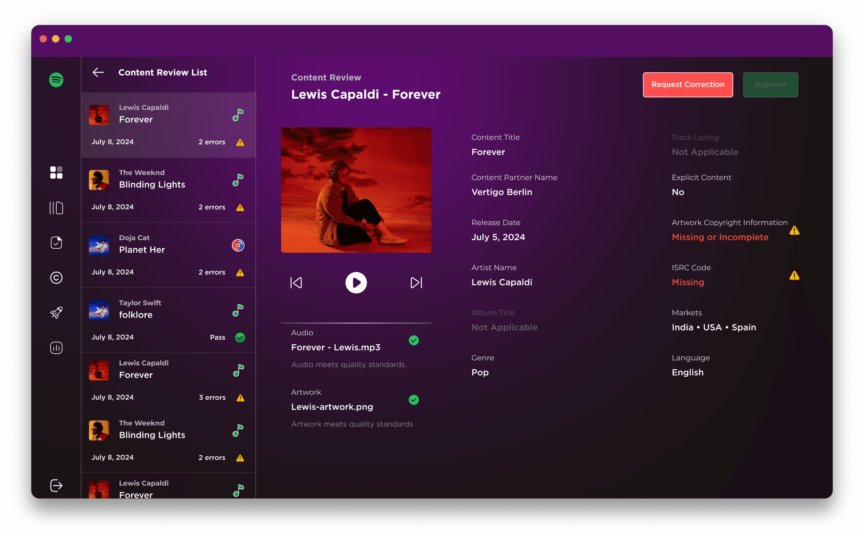 Each delivery includes audio, artwork, metadata, and release details. Before anything goes live, assets pass through validation and review steps that ensure accuracy, rights compliance, and quality.