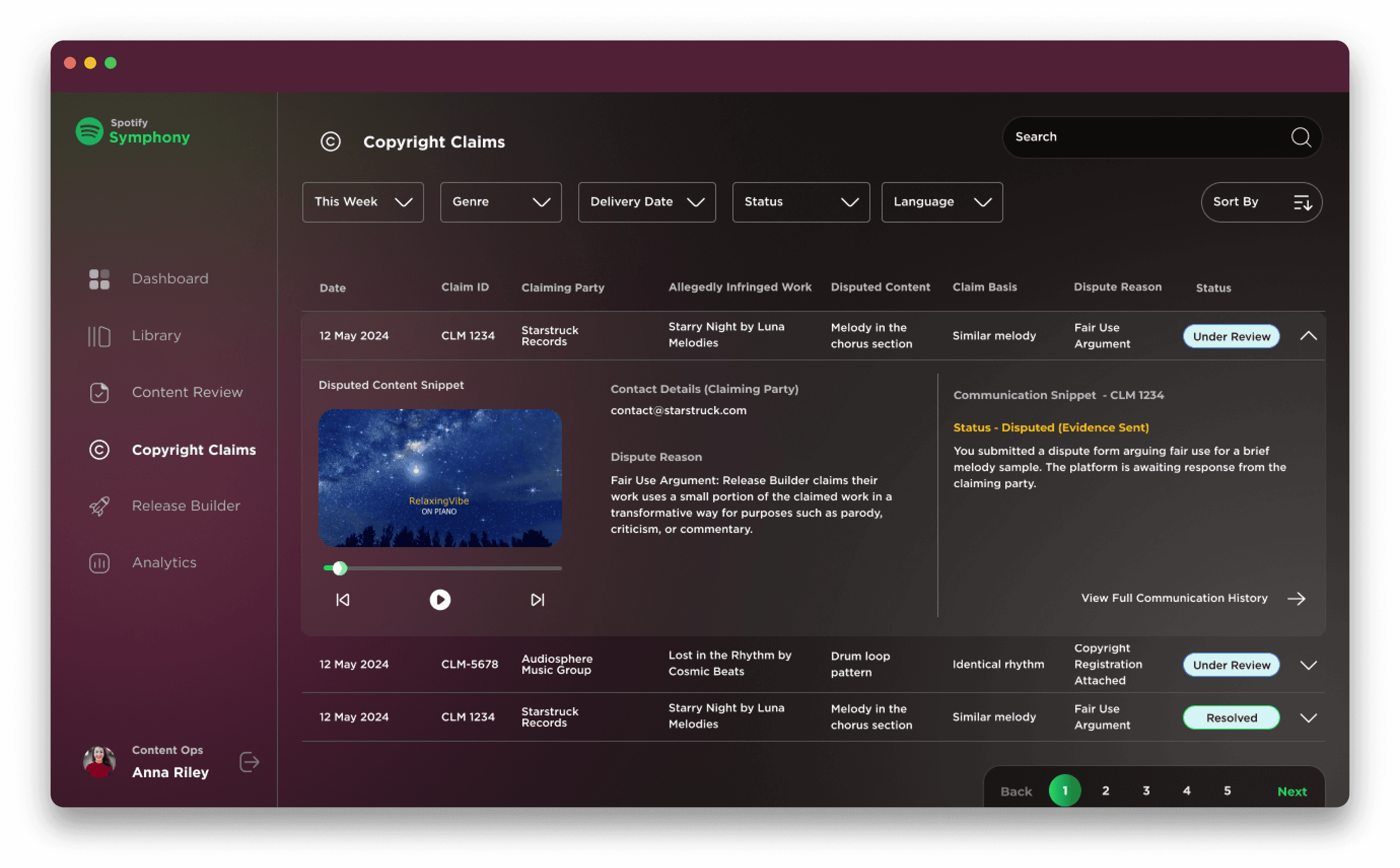Claims surface with context (infringed work, dispute reason, comms history), making investigations faster and resolutions traceable.