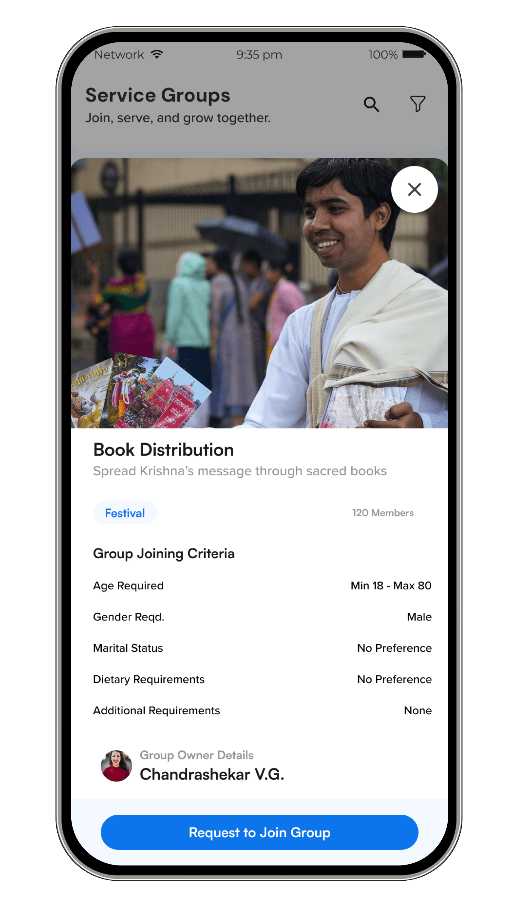 Faster seva discovery and joining through scan-friendly groups and clearer context.