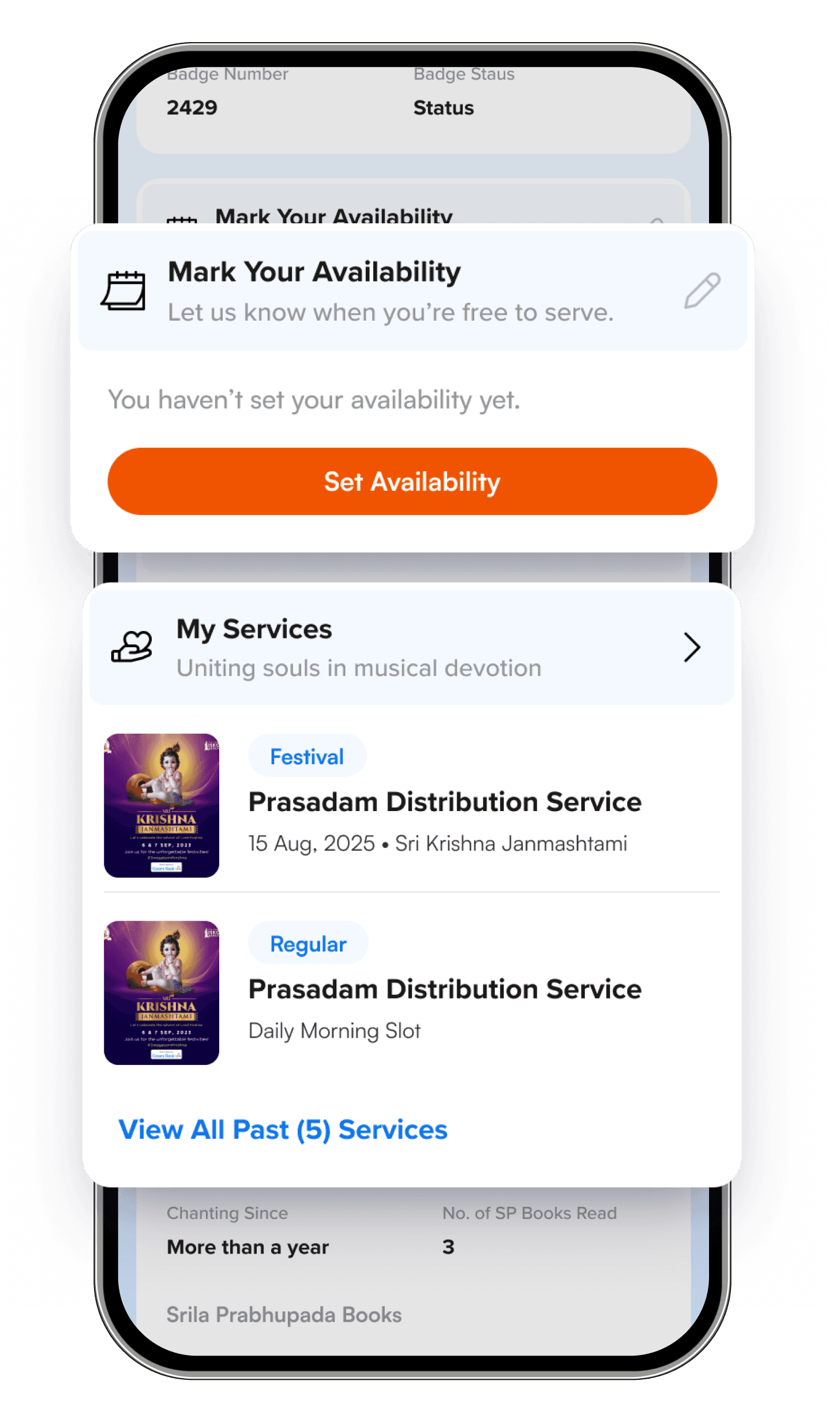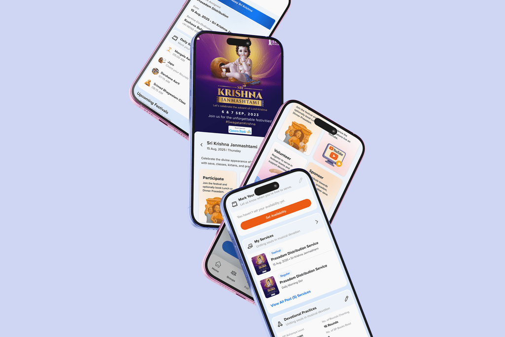 A mobile volunteer companion for VCM temple that simplifies seva discovery, festival participation, and attendance — all in a calm, devotional flow.