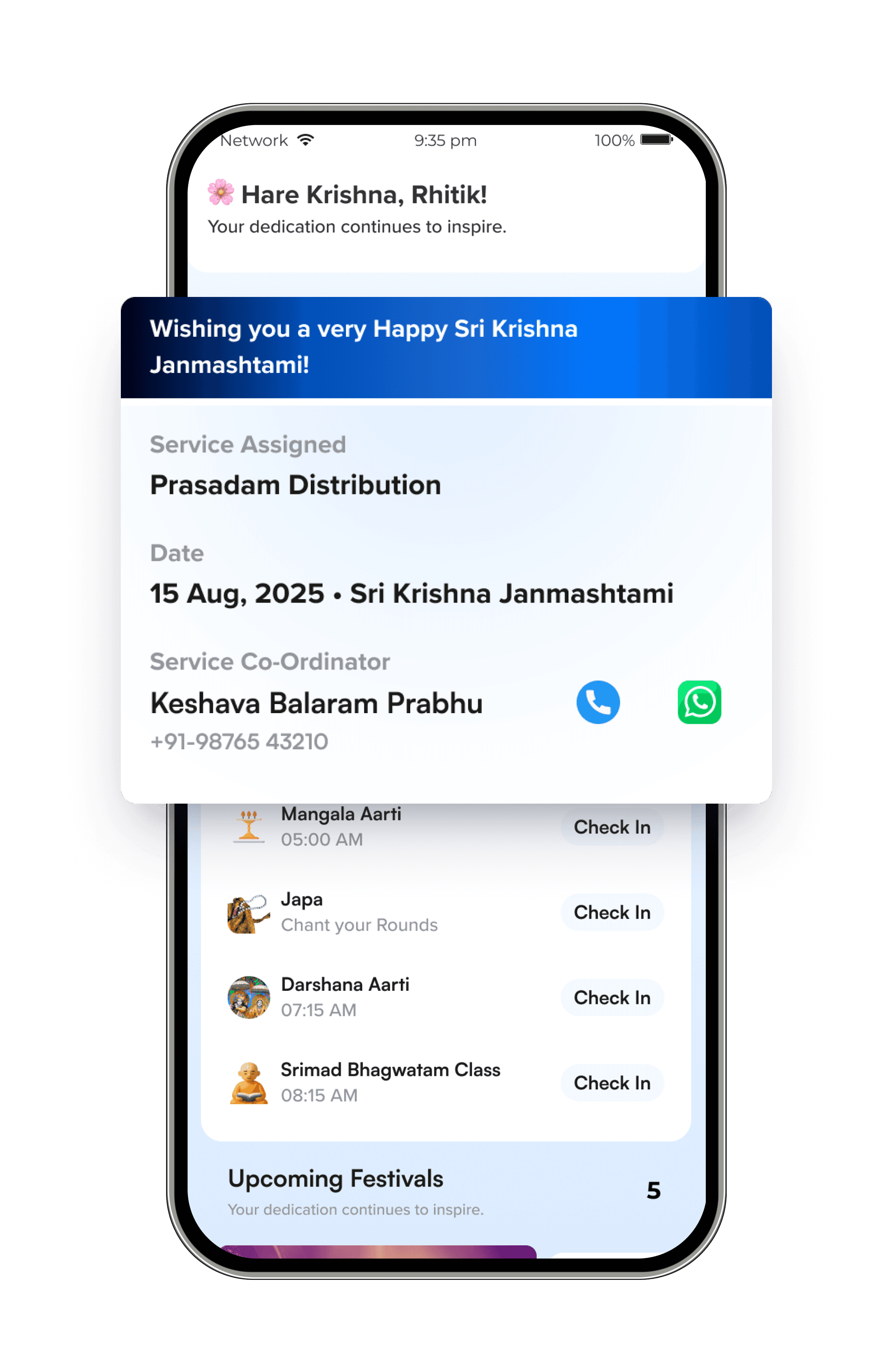 A guided home experience that anchors volunteers with a devotional greeting, quick sadhana snapshot, upcoming festivals, and assigned seva — making “what’s next” instantly visible.